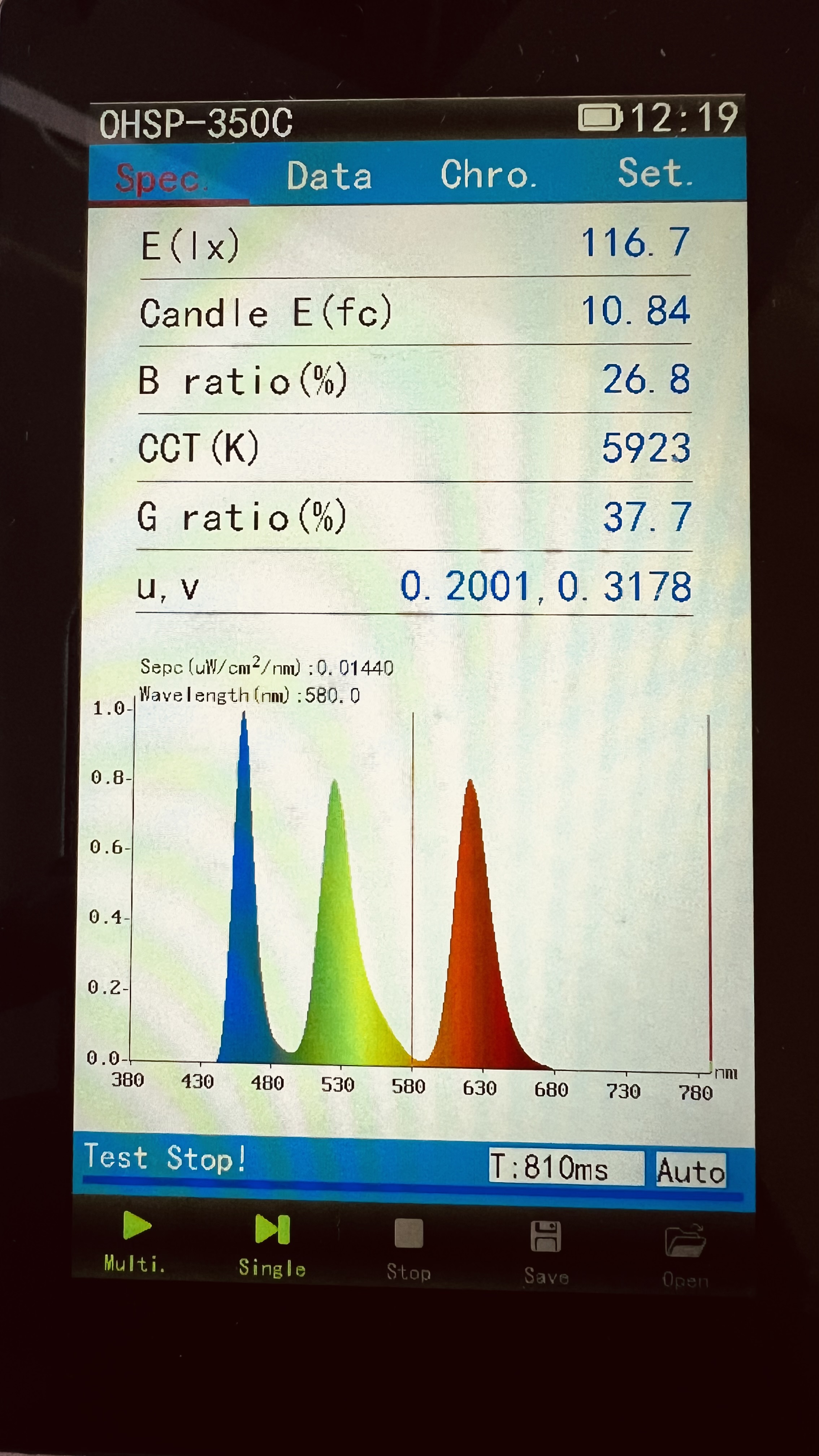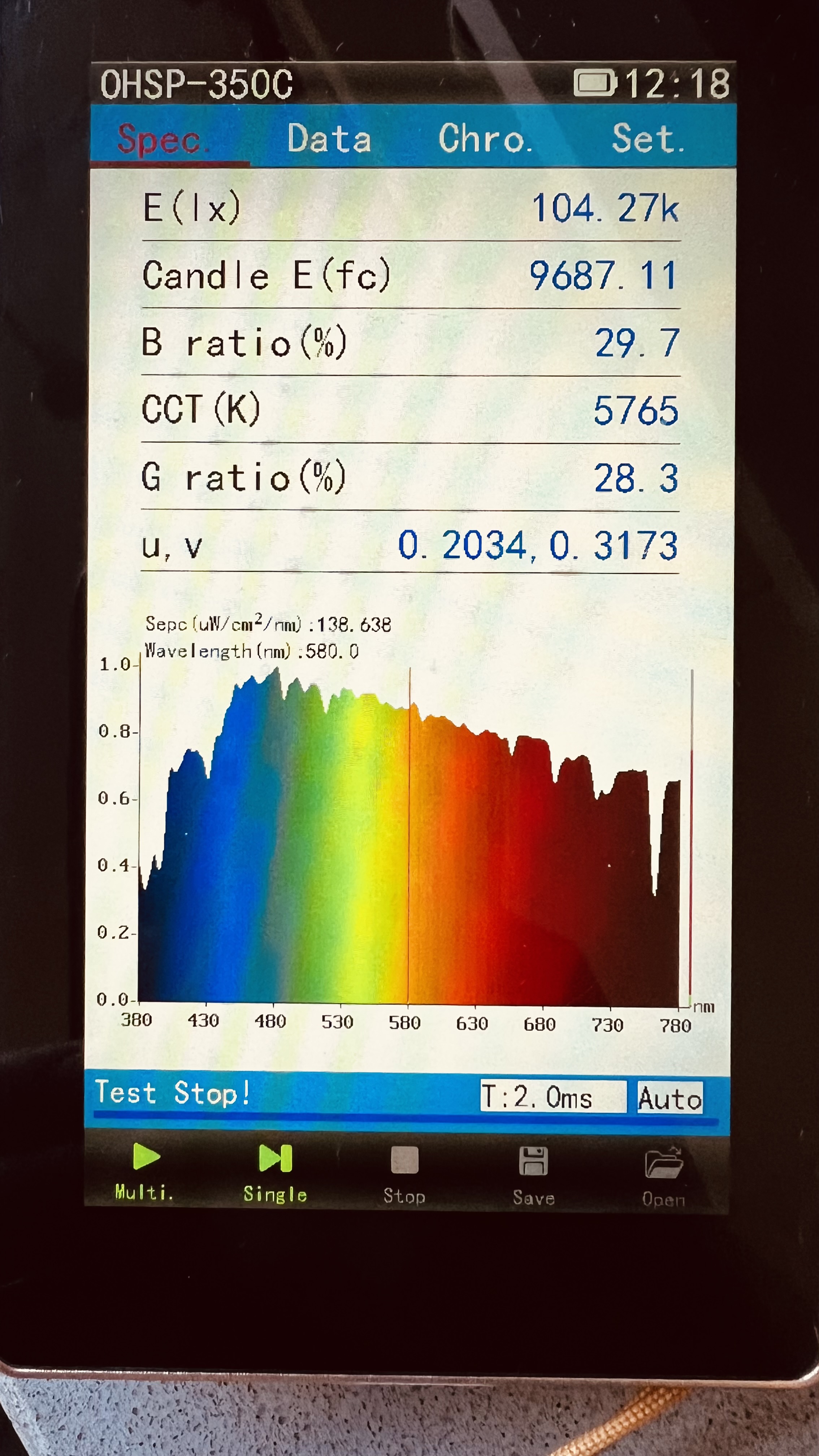 Onderstaand zie je een spectrometer meting. Dit is het natuurlijk licht van de zon.